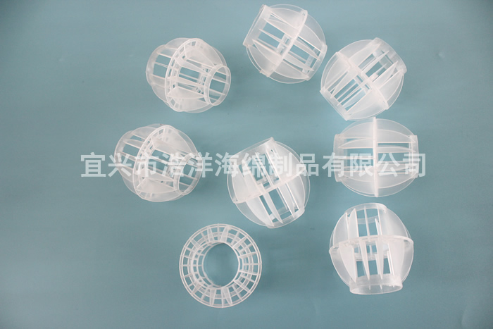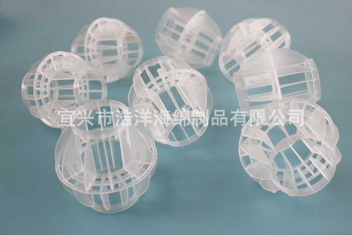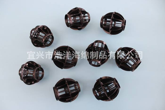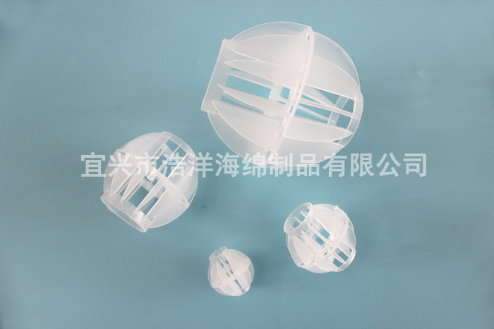 采用聚丙烯(PP)塑料制成球狀,由兩個(gè)半球合成一個(gè)球形;每個(gè)半球上開(kāi)有8-12個(gè)半扇形葉片,中部沿整個(gè)周長(cháng)有一道加固環(huán),上下球瓣互相交錯,葉片均勻分布在上面,軸呈放射形布置。該填料特點(diǎn)是氣速高、葉片多,比表面積大、空隙率較高、可以充分解決氣液交換;況且此填料還具有重量輕、強度高、自由空間大、耐高溫、耐腐蝕、表面親水性能好、風(fēng)阻小、電耗少、適應多種溶劑的處理裝置。廣泛應用于二氧化碳脫氣塔、接觸反應塔、廢氣凈化塔、酸霧凈化塔等環(huán)保設備中。